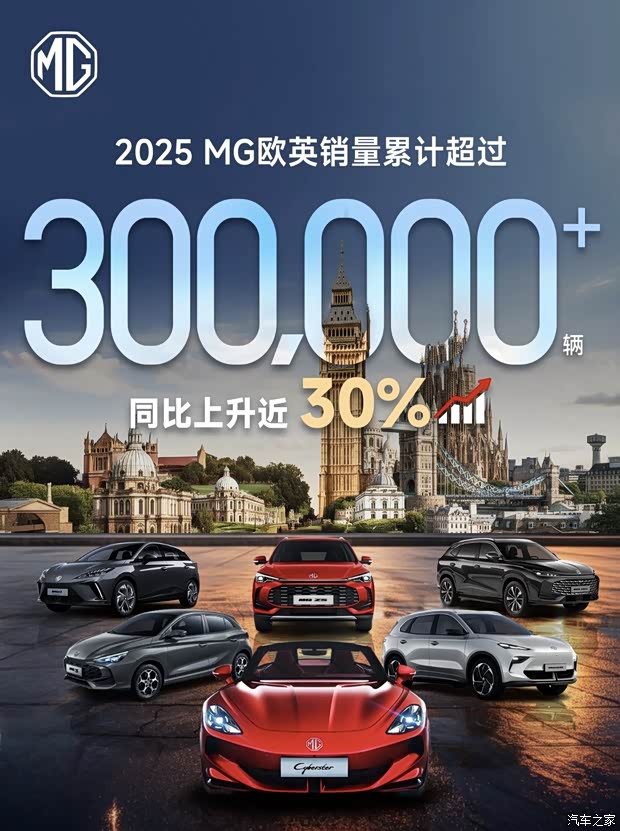 全新MG4上市4个月连续销量破万,12月交付突破1.3万辆。2025MG欧英销量累计超过30万辆,同比上升近30%。其中,纯电车型销量突破46000辆,混动车型销量突破137000辆,同比上升300%,MG ZS家族销量超123000辆。据悉,MG品牌2026年将推出7款新能源车型,实现轿车SUV全覆盖,力争到2027年形成完整的车型矩阵和体系。到2027年年底推出13款新能源车型,最终目标是实现年销百万。