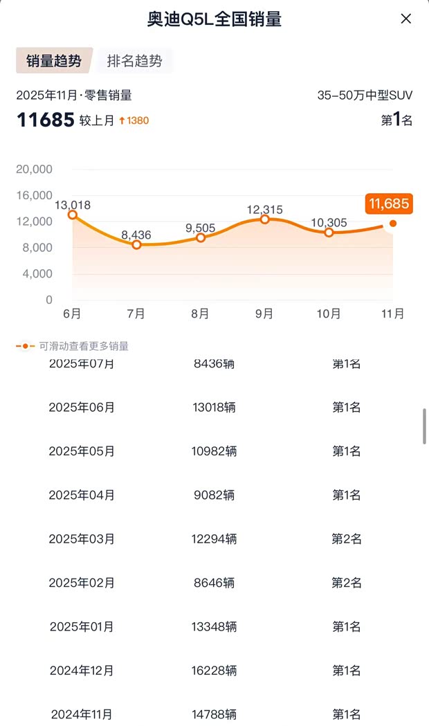 通过最新资讯销量榜单可以看到,即便如今奥迪Q5L已经进入到产品周期的末端,奔驰GLC和宝马X3也纷纷变成了奔驰GLC L和宝马X3L,但是奥迪Q5L依然保持着十分强势的市场表现,稳居细分市场的销量冠军。对于它的继任者来说说,无疑也是巨大的荣耀与压力并存。